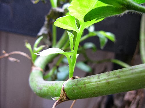 Pelargonium 'Dronning Ingrid' har avsluttet sin siste blomsterflørt for i år. Etter at den ene planten veltet og ble litt skadet, klippet jeg av toppen og satte ned i potten - fort og galt. Jammen er det kommet nye skudd, og det ser ut til at jeg nå har enda en plante. Hm, jeg har jo egentlig mange nok, men kan alltids ta med flere til feriehagen. Pelargonium overvintrer perfekt i et relativt uoppvarmet feriehus.